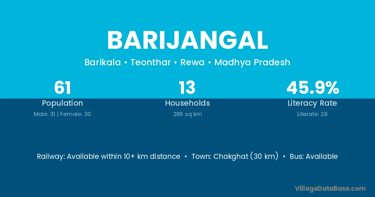 Barijangal village has a total population of 61 people, of which 31 are males and 30 are females.