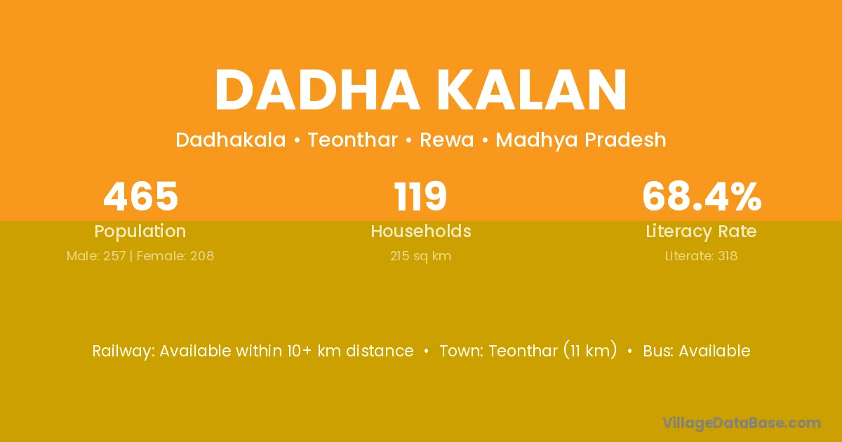 Teonthar (11 km) is the nearest town to Dadha Kalan village for major economic activities and is located approximately 11 km away.