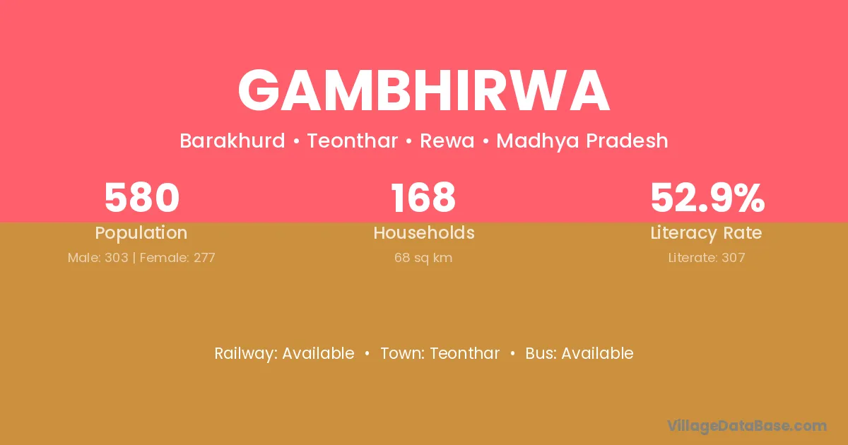 Gambhirwa village has a total population of 580 people, of which 303 are males and 277 are females.