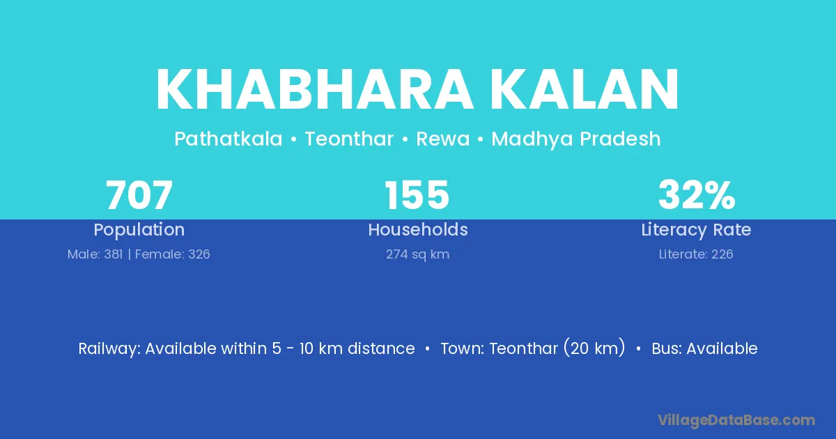 Teonthar (20 km) is the nearest town to Khabhara Kalan village for major economic activities and is located approximately 20 km away.
