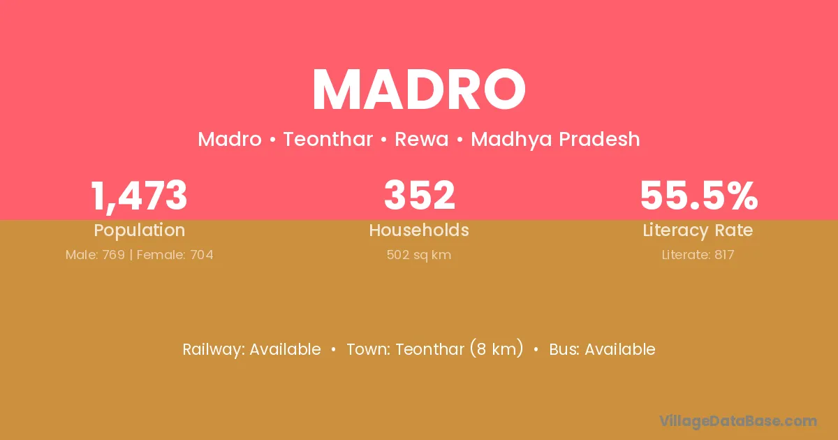 Teonthar (8 km) is the nearest town to Madro village for major economic activities and is located approximately 8 km away.