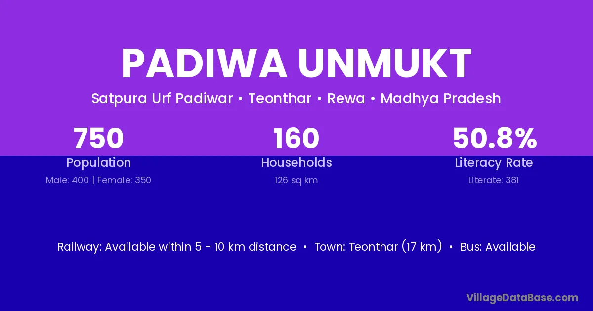 Teonthar (17 km) is the nearest town to Padiwa Unmukt village for major economic activities and is located approximately 17 km away.