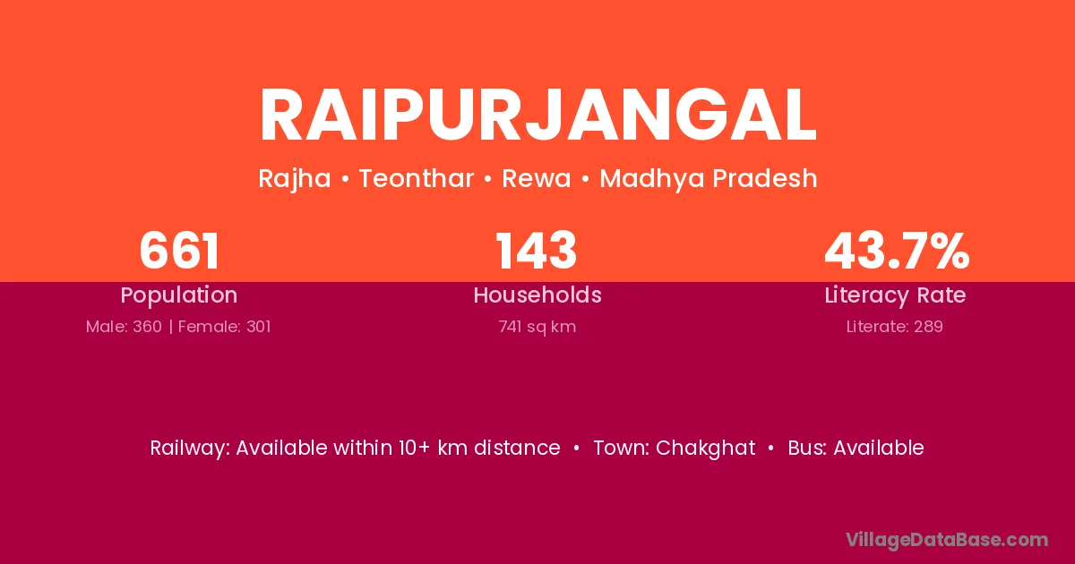 Raipurjangal village has a total population of 661 people, of which 360 are males and 301 are females.