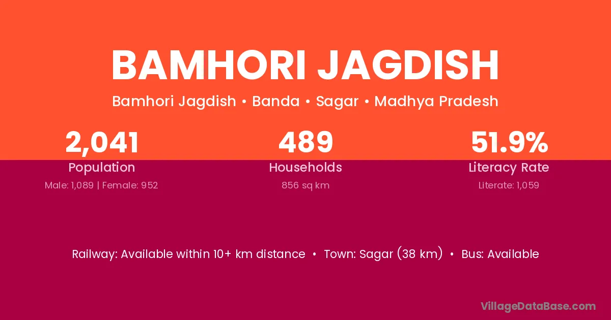 Sagar (38 km) is the nearest town to Bamhori Jagdish village for major economic activities and is located approximately 38 km away.