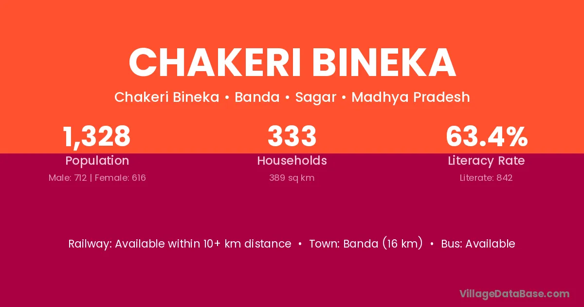 Banda (16 km) is the nearest town to Chakeri Bineka village for major economic activities and is located approximately 16 km away.