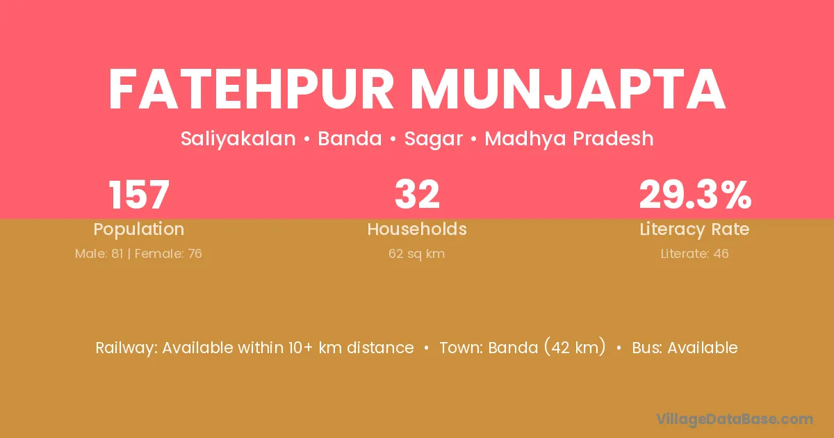 Banda (42 km) is the nearest town to Fatehpur Munjapta village for major economic activities and is located approximately 42 km away.