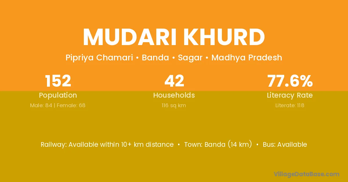 Banda (14 km) is the nearest town to Mudari Khurd village for major economic activities and is located approximately 14 km away.