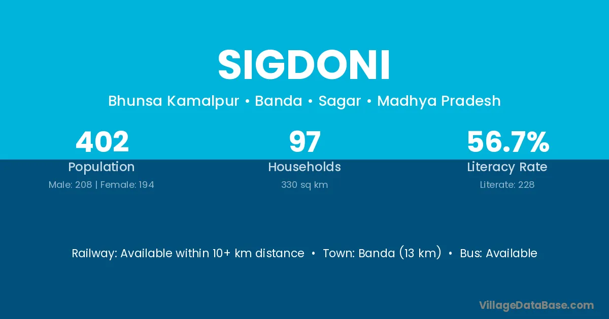 Banda (13 km) is the nearest town to Sigdoni village for major economic activities and is located approximately 13 km away.