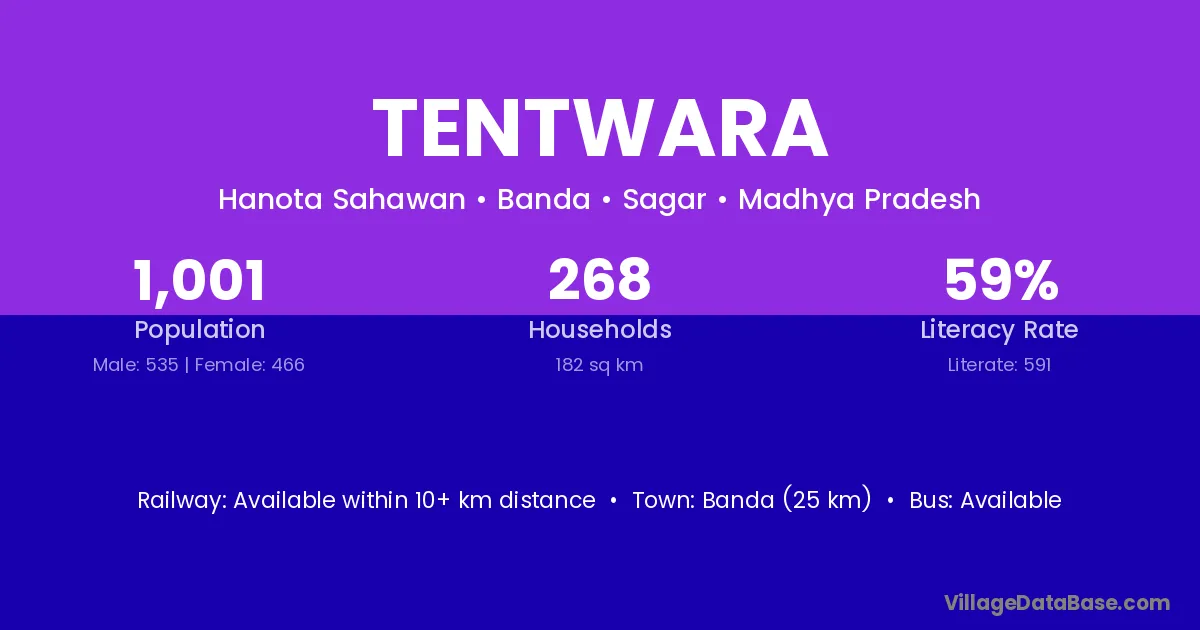 Banda (25 km) is the nearest town to Tentwara village for major economic activities and is located approximately 25 km away.