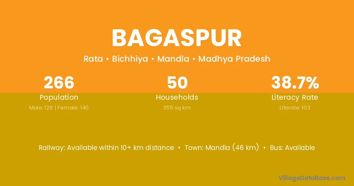 Bina-etawa (26 km) is the nearest town to Bagaspur village for major economic activities and is located approximately 26 km away.