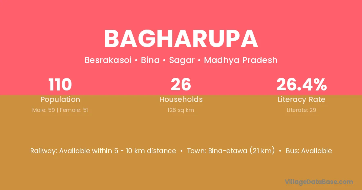 Bina-etawa (21 km) is the nearest town to Bagharupa village for major economic activities and is located approximately 21 km away.