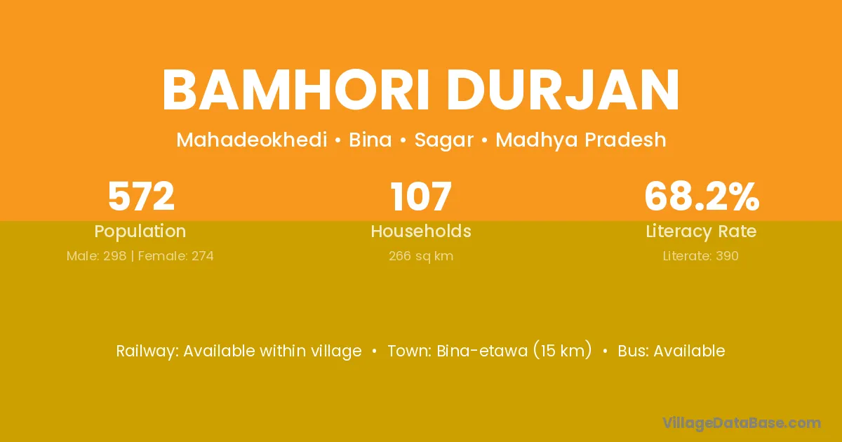 Bina-etawa (15 km) is the nearest town to Bamhori Durjan village for major economic activities and is located approximately 15 km away.