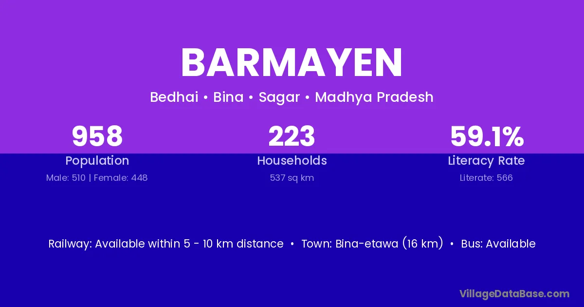 Bina-etawa (16 km) is the nearest town to Barmayen village for major economic activities and is located approximately 16 km away.
