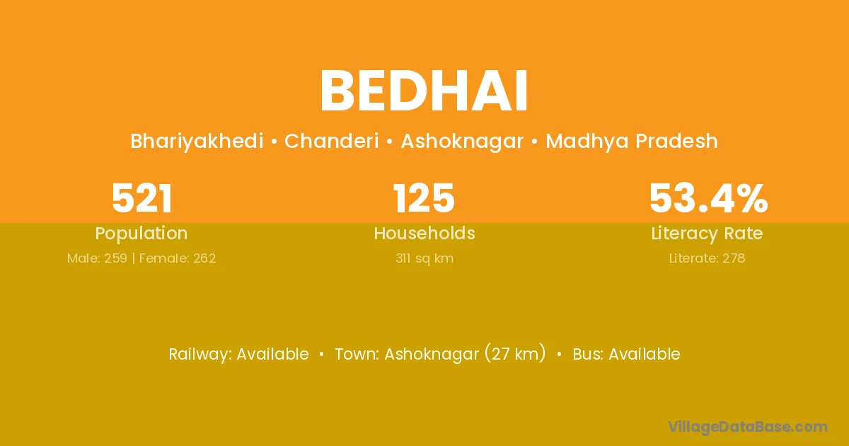 Bina-etawa (17 km) is the nearest town to Bedhai village for major economic activities and is located approximately 17 km away.