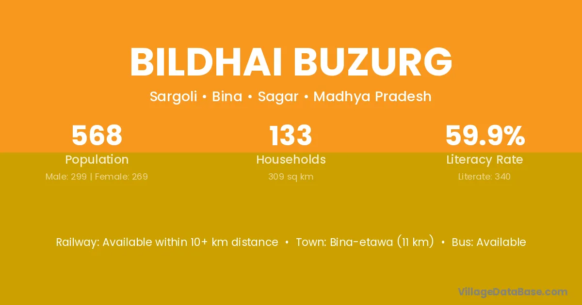 Bina-etawa (11 km) is the nearest town to Bildhai Buzurg village for major economic activities and is located approximately 11 km away.
