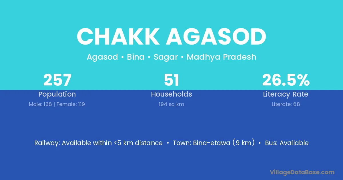 Bina-etawa (9 km) is the nearest town to Chakk Agasod village for major economic activities and is located approximately 9 km away.