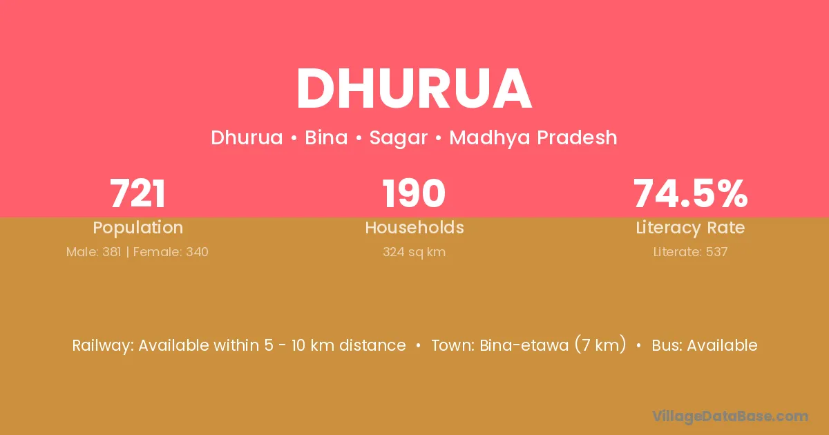Bina-etawa (7 km) is the nearest town to Dhurua village for major economic activities and is located approximately 7 km away.