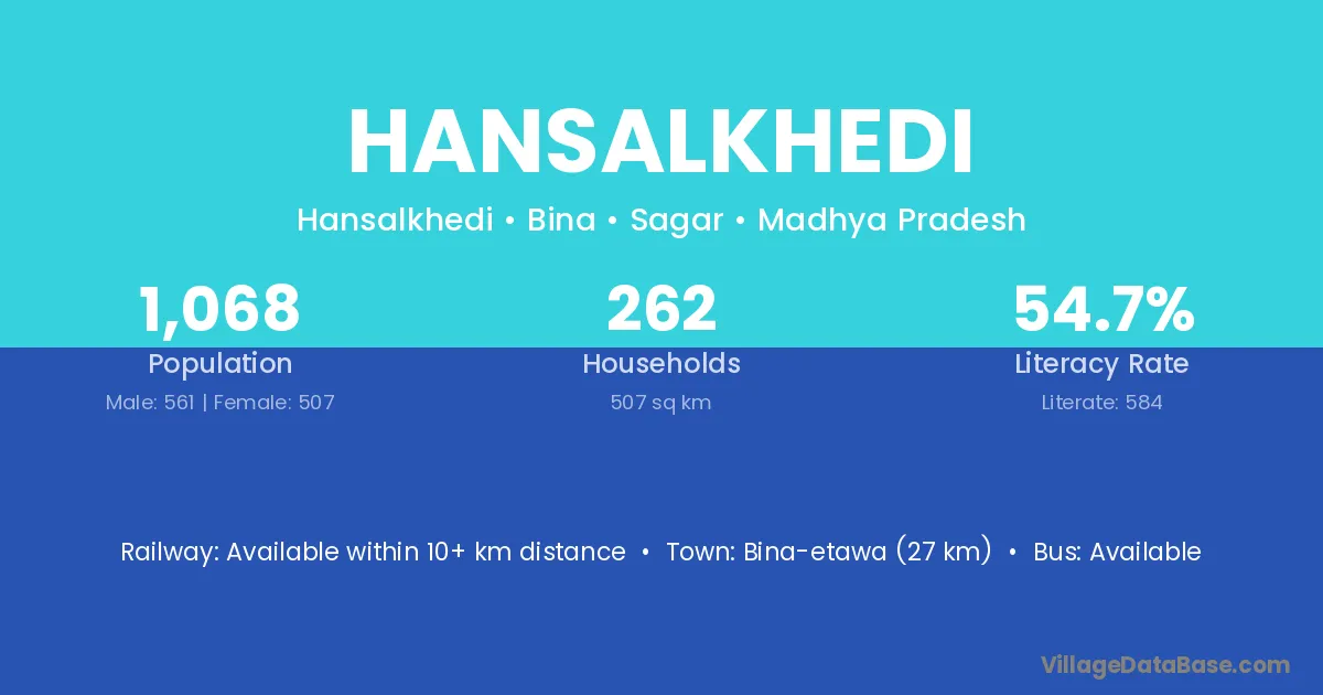 Bina-etawa (27 km) is the nearest town to Hansalkhedi village for major economic activities and is located approximately 27 km away.