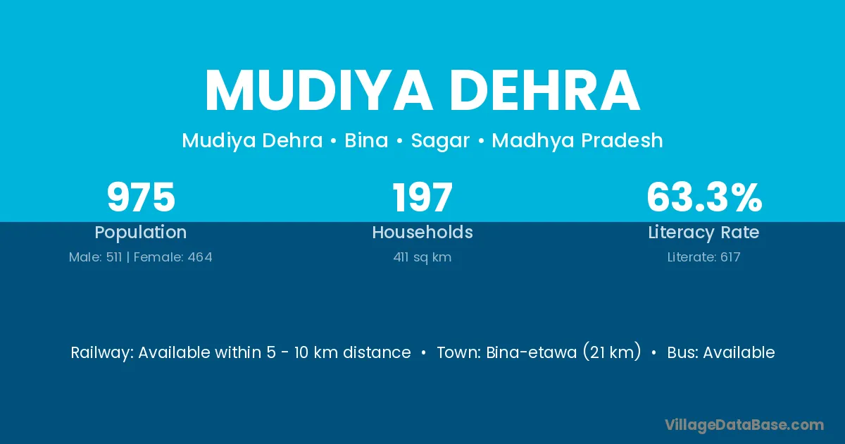 Bina-etawa (21 km) is the nearest town to Mudiya Dehra village for major economic activities and is located approximately 21 km away.