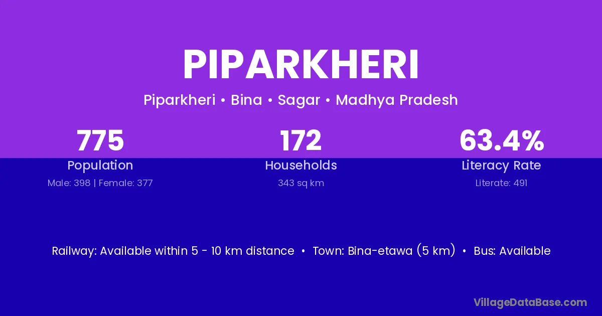 Bina-etawa (5 km) is the nearest town to Piparkheri village for major economic activities and is located approximately 5 km away.