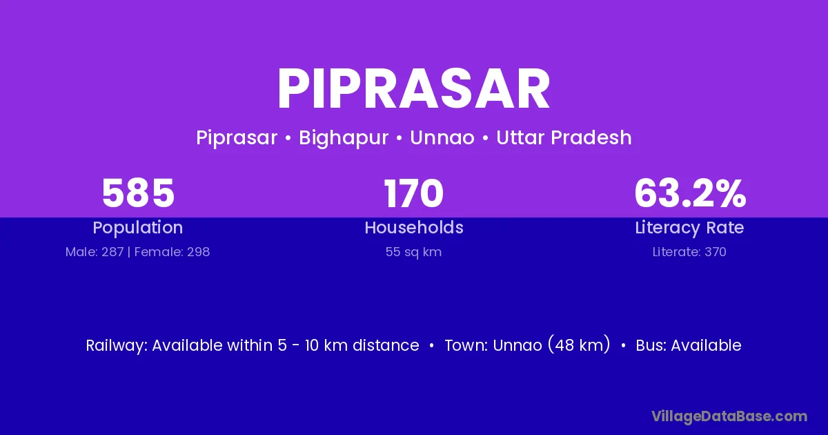 The literacy rate of Piprasar village is 63.18%. Male literacy stands at 71.50% and female literacy at 53.45%.