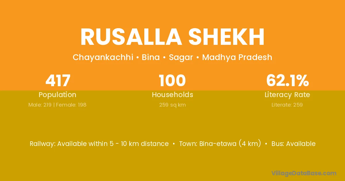 Bina-etawa (4 km) is the nearest town to Rusalla Shekh village for major economic activities and is located approximately 4 km away.