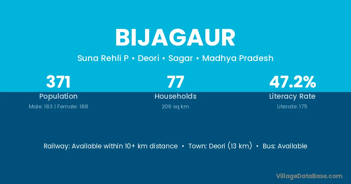 Deori (13 km) is the nearest town to Bijagaur village for major economic activities and is located approximately 13 km away.