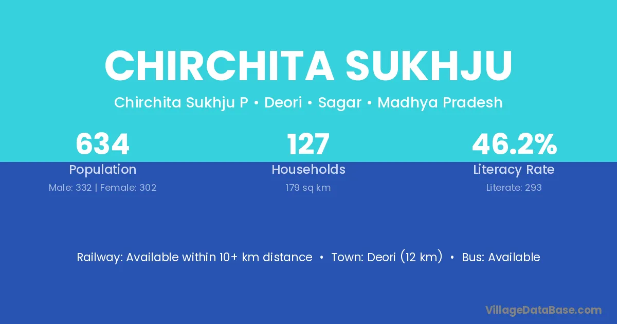 Deori (12 km) is the nearest town to Chirchita Sukhju village for major economic activities and is located approximately 12 km away.
