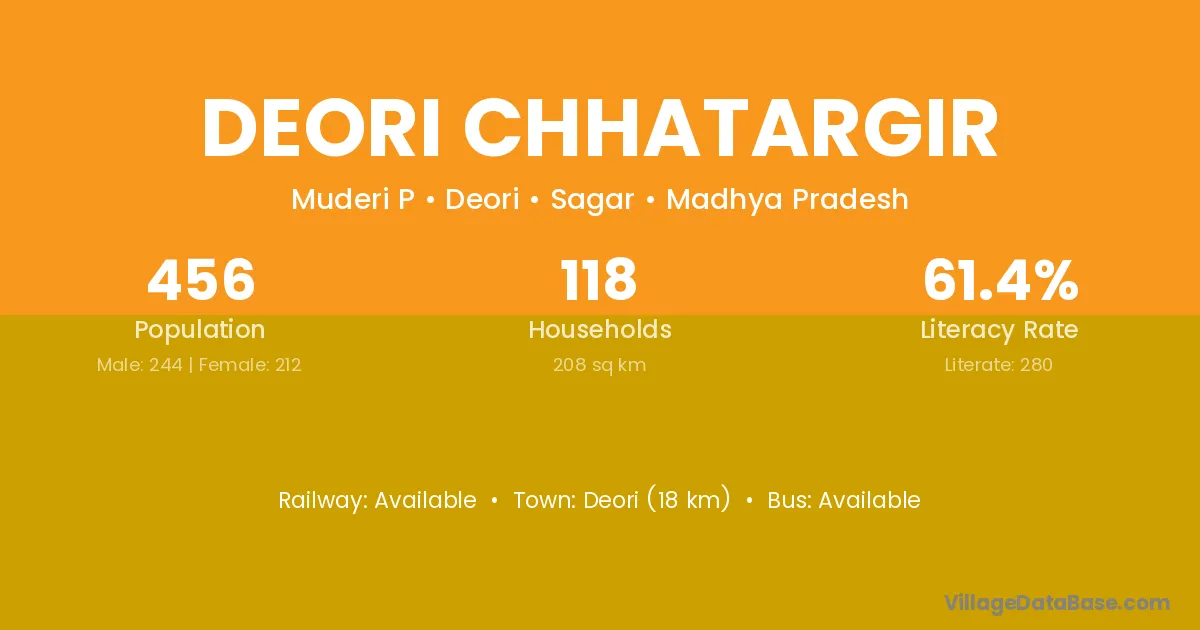 Deori (18 km) is the nearest town to Deori Chhatargir village for major economic activities and is located approximately 18 km away.
