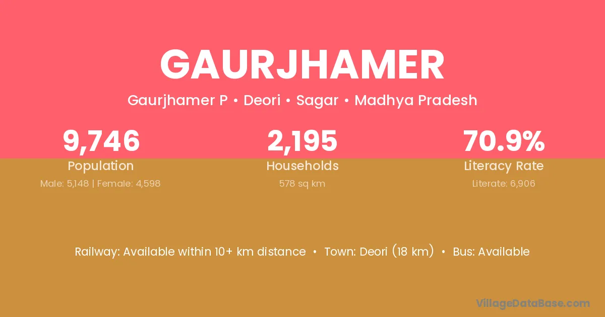 Deori (18 km) is the nearest town to Gaurjhamer village for major economic activities and is located approximately 18 km away.