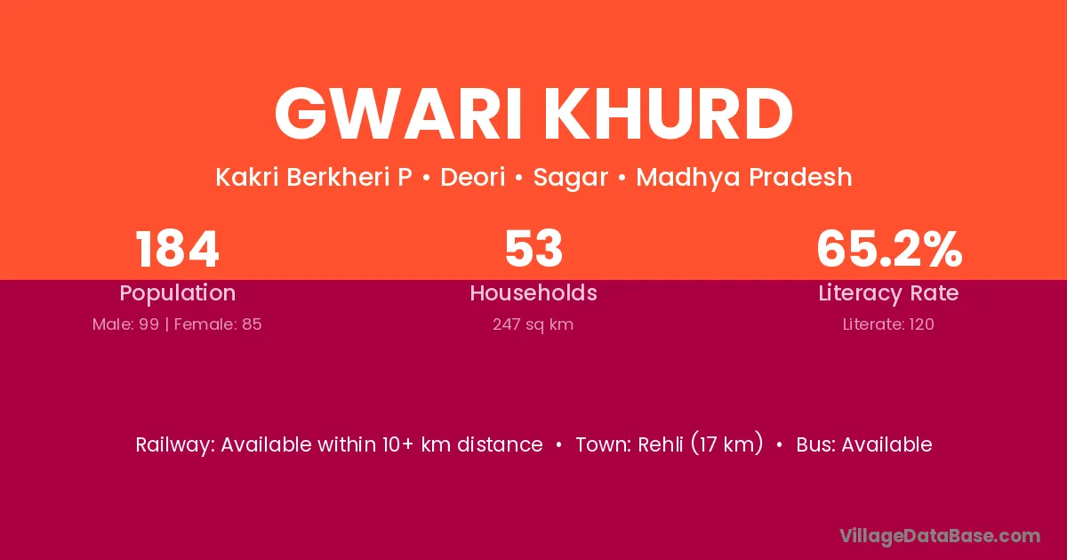 Rehli (17 km) is the nearest town to Gwari Khurd village for major economic activities and is located approximately 17 km away.