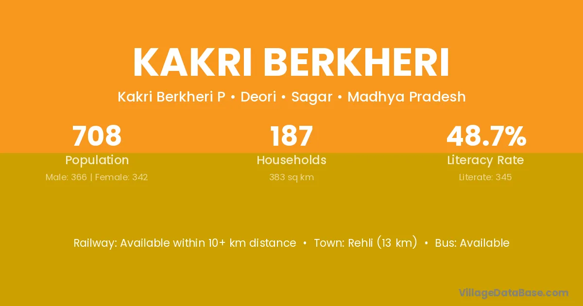 Rehli (13 km) is the nearest town to Kakri Berkheri village for major economic activities and is located approximately 13 km away.