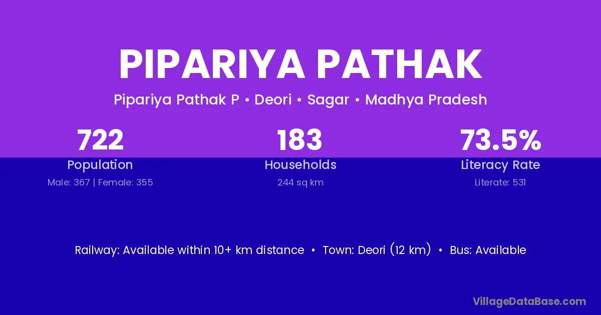 Deori (12 km) is the nearest town to Pipariya Pathak village for major economic activities and is located approximately 12 km away.