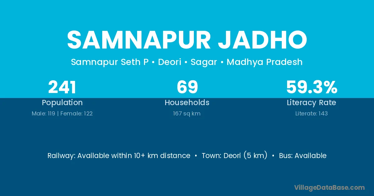 Deori (5 km) is the nearest town to Samnapur Jadho village for major economic activities and is located approximately 5 km away.