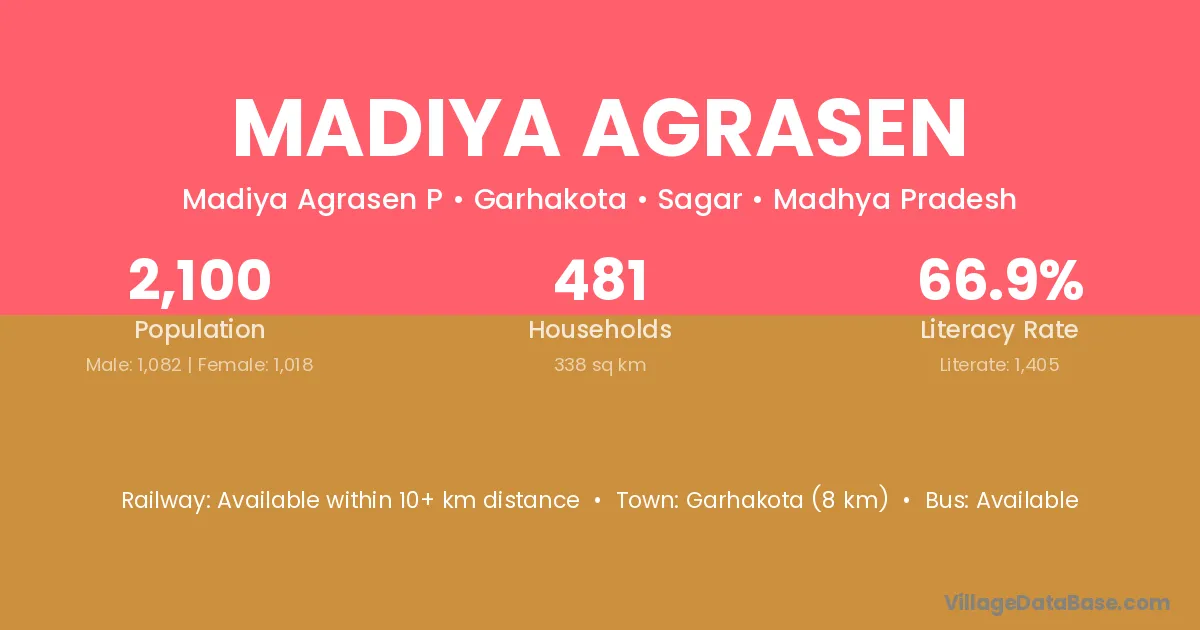 Garhakota (8 km) is the nearest town to Madiya Agrasen village for major economic activities and is located approximately 8 km away.