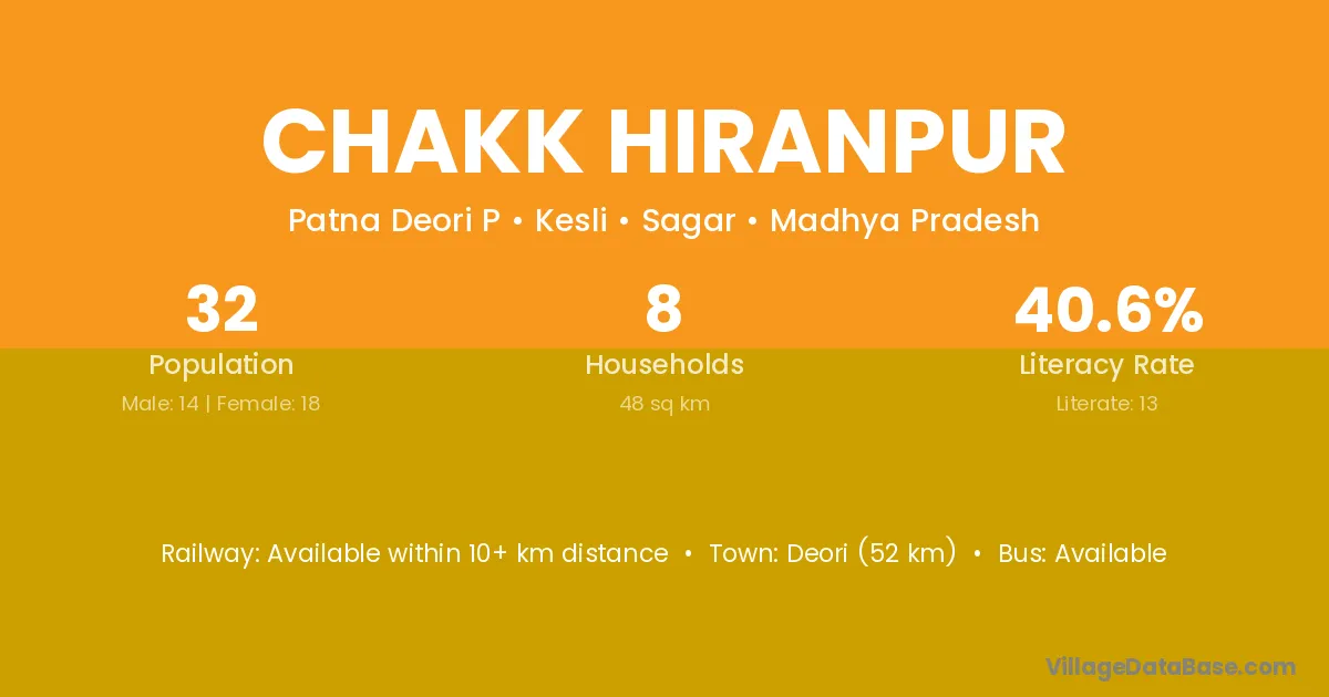 Deori (52 km) is the nearest town to Chakk Hiranpur village for major economic activities and is located approximately 52 km away.
