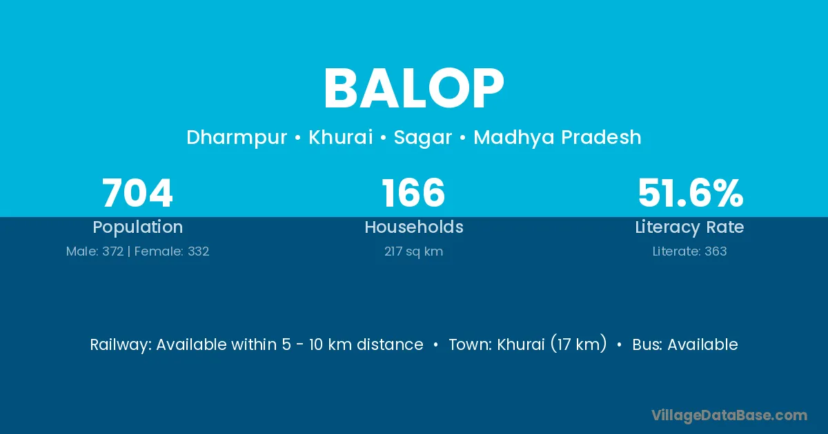 Khurai (17 km) is the nearest town to Balop village for major economic activities and is located approximately 17 km away.