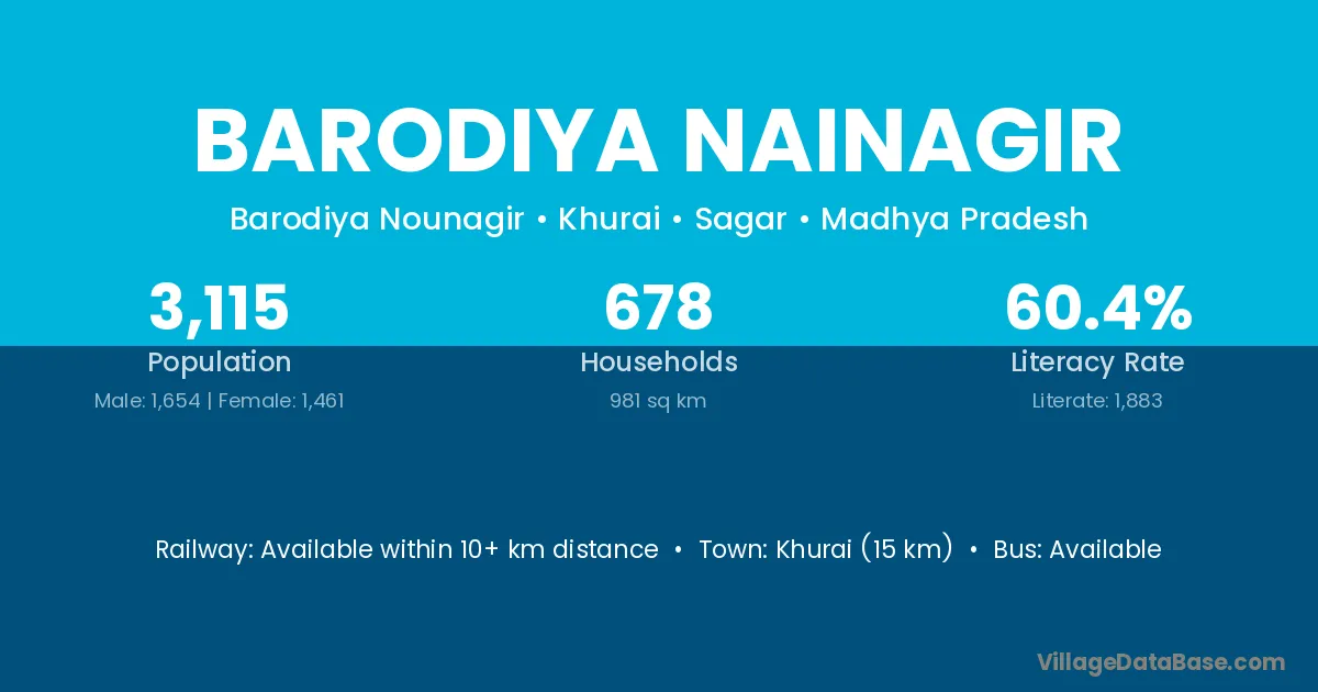Khurai (15 km) is the nearest town to Barodiya Nainagir village for major economic activities and is located approximately 15 km away.