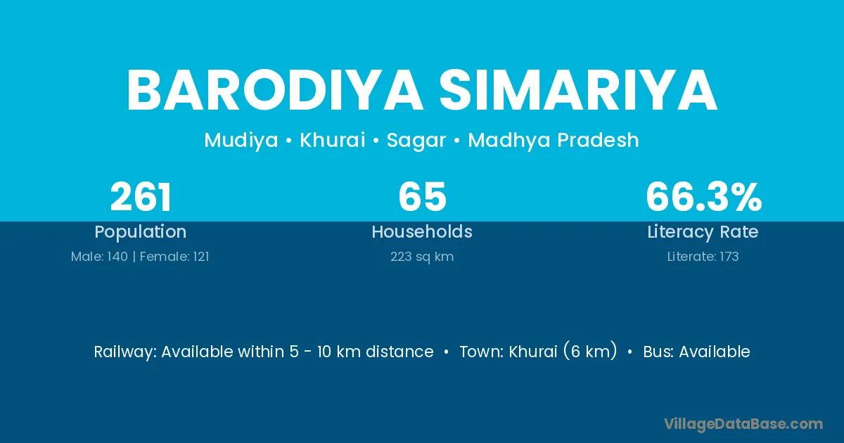 Khurai (6 km) is the nearest town to Barodiya Simariya village for major economic activities and is located approximately 6 km away.