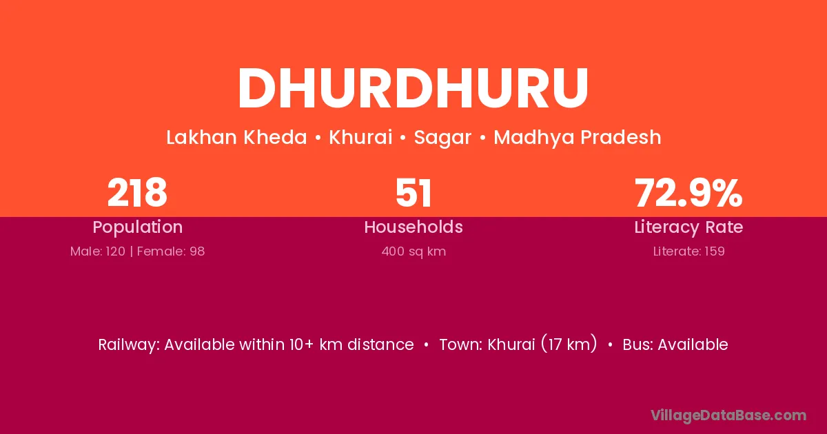 Khurai (17 km) is the nearest town to Dhurdhuru village for major economic activities and is located approximately 17 km away.