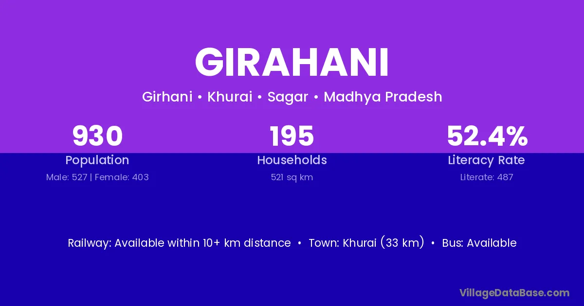 Khurai (33 km) is the nearest town to Girahani village for major economic activities and is located approximately 33 km away.