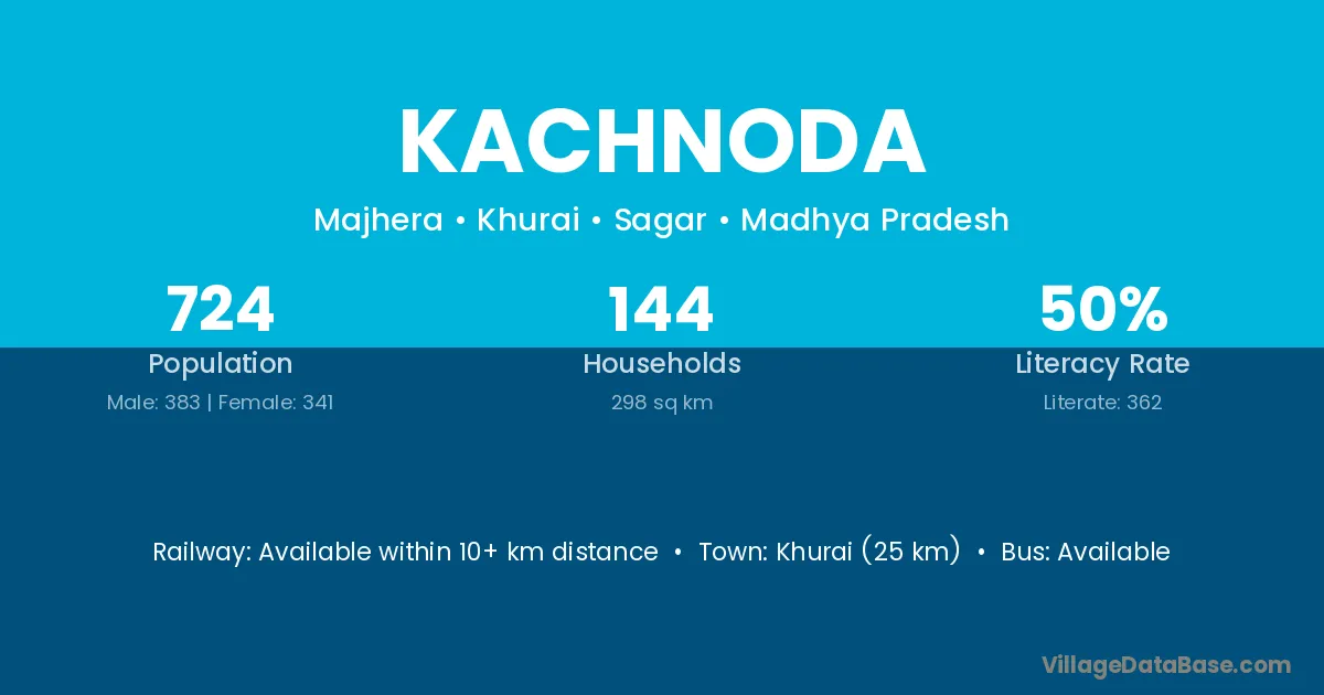 Khurai (25 km) is the nearest town to Kachnoda village for major economic activities and is located approximately 25 km away.