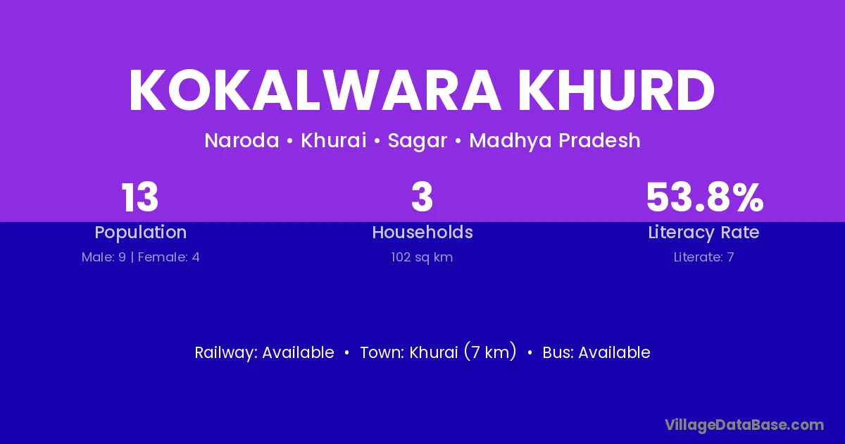 Kokalwara Khurd village has a total population of 13 people, of which 9 are males and 4 are females.