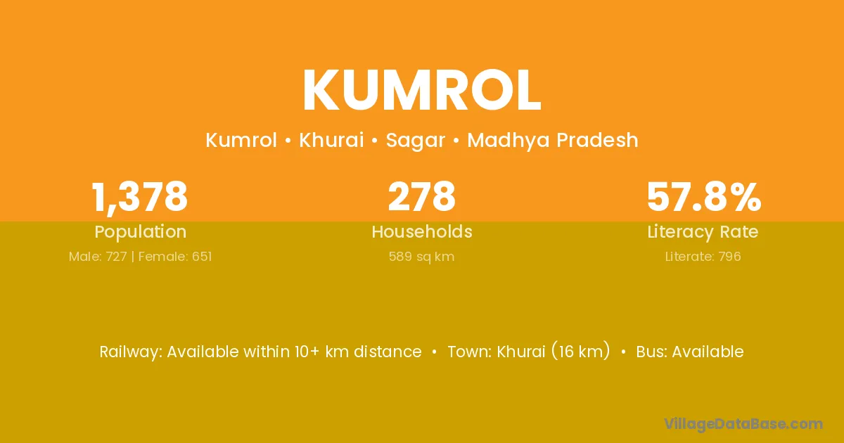 Khurai (16 km) is the nearest town to Kumrol village for major economic activities and is located approximately 16 km away.