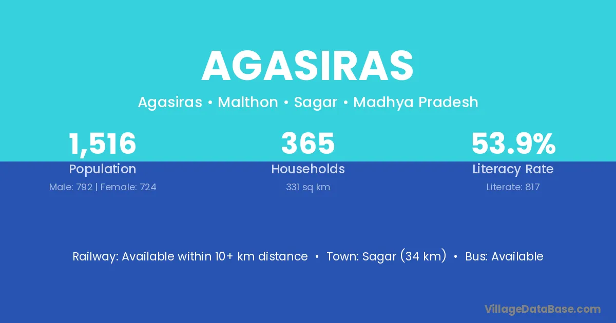 Sagar (34 km) is the nearest town to Agasiras village for major economic activities and is located approximately 34 km away.