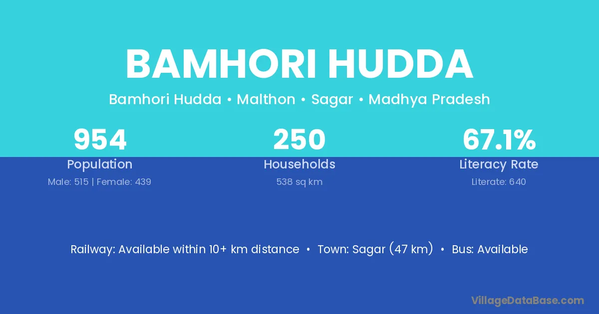 Sagar (47 km) is the nearest town to Bamhori Hudda village for major economic activities and is located approximately 47 km away.