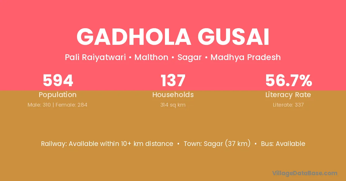 Sagar (37 km) is the nearest town to Gadhola Gusai village for major economic activities and is located approximately 37 km away.