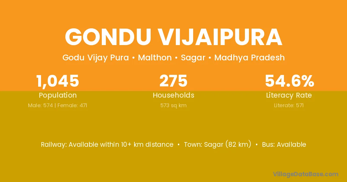 Sagar (82 km) is the nearest town to Gondu Vijaipura village for major economic activities and is located approximately 82 km away.