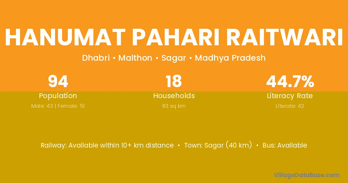 Sagar (40 km) is the nearest town to Hanumat Pahari Raitwari village for major economic activities and is located approximately 40 km away.