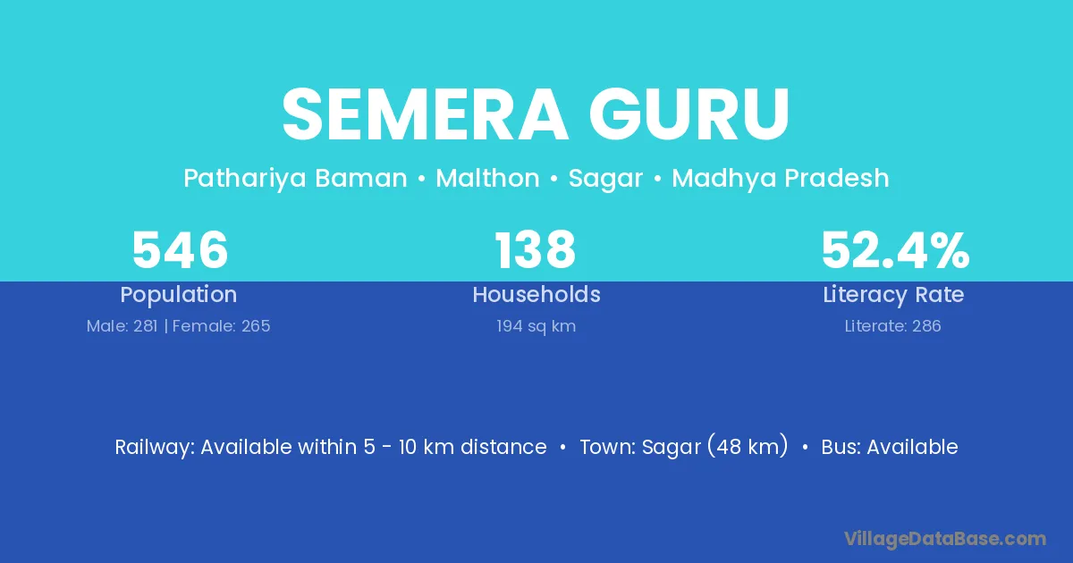 Sagar (48 km) is the nearest town to Semera Guru village for major economic activities and is located approximately 48 km away.